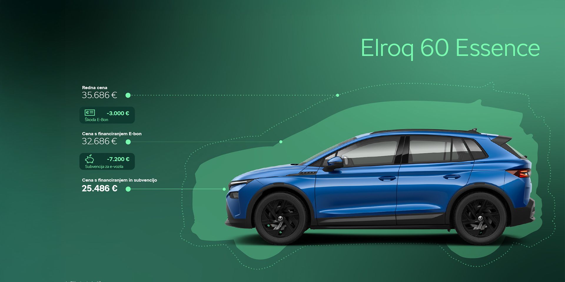 To pomeni, da lahko Elroq stane do 38.000 evrov, vi pa si njegovo ceno znižate z E-Bonom v višini 3.000 evrov in tako še vedno prejmete najvišji znesek subvencije v višini 7.200 evrov.